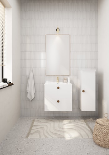 Hold deg til lyse farger på gulv og vegger. Det gir mer lys og romfølelse. La tekstiler stå for fargene. Ryddighet er alfa og omega på små bad.
